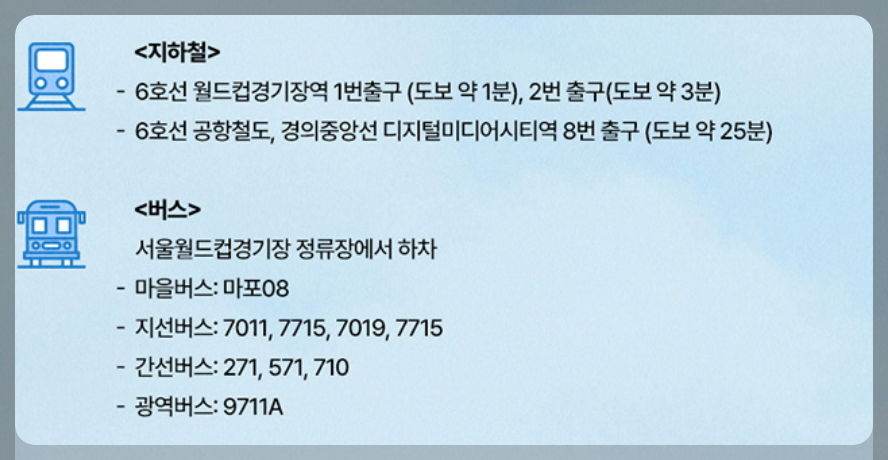 - 지하철: 6호선 월드컵경기장 1번 출구