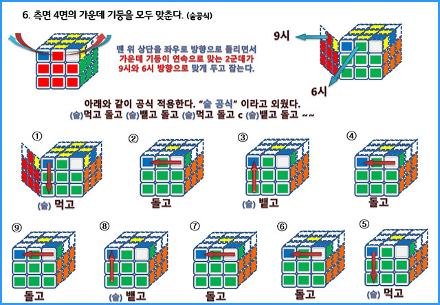 이제 노란색 면을 맞추는 단계입니다. 노란색 십자를 만들기 위해서는 몇 가지 공식을 사용해야 합니다. 이 단계에서의 정확한 조작이 중요합니다.